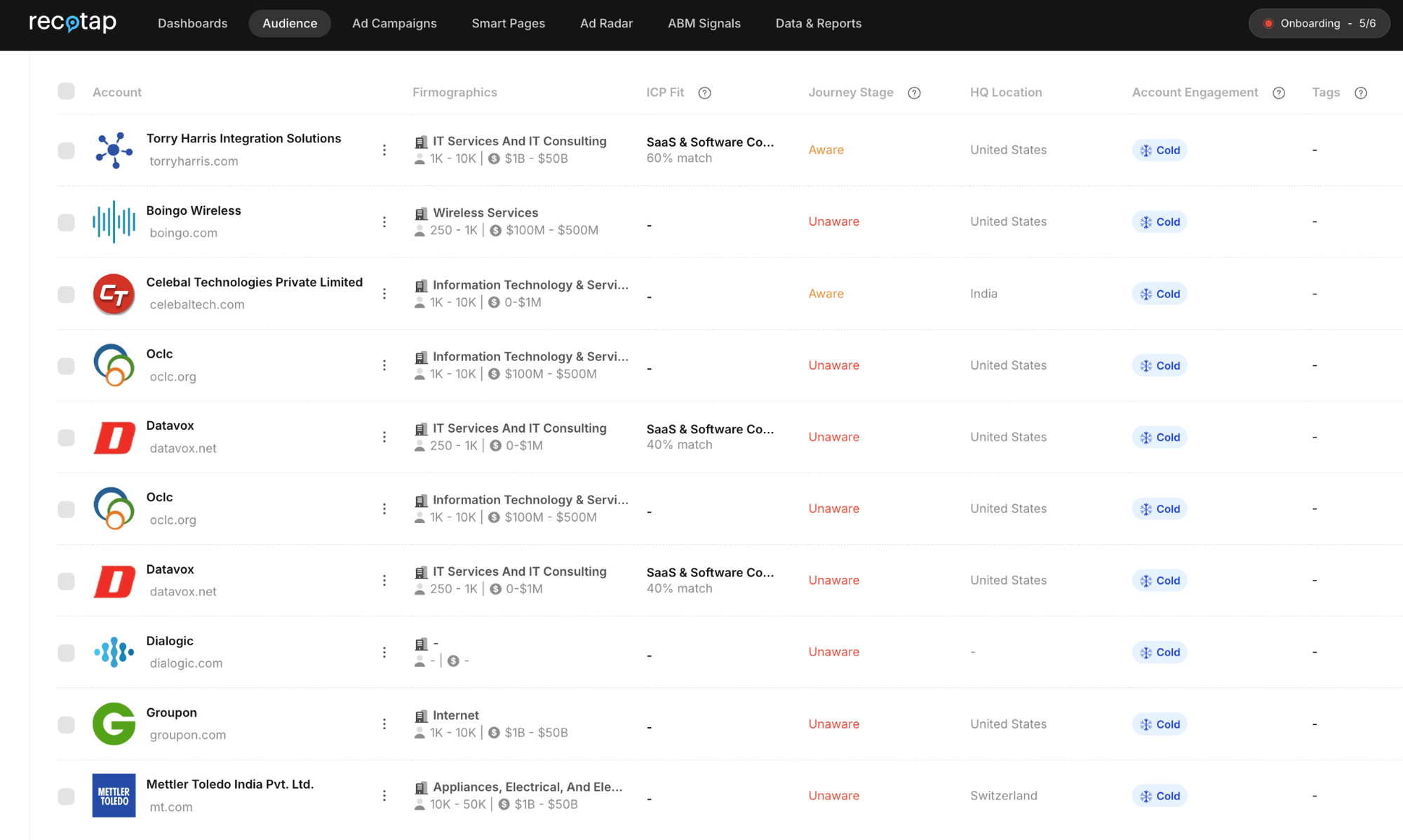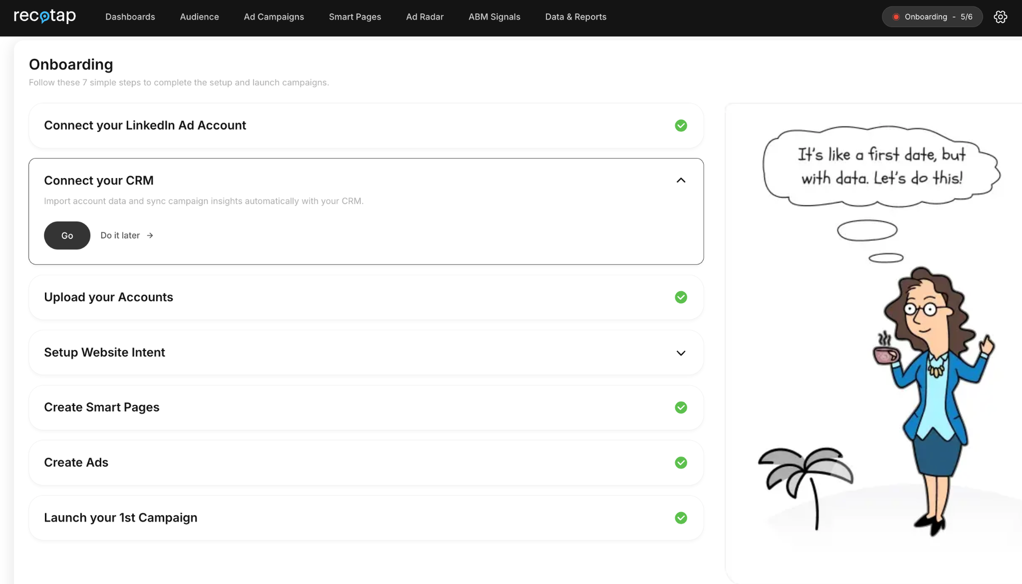 Supported onboarding teams typically go live within 4 to 6 weeks. During that window, Recotap's CS team handles orchestration setup, TAL import, CRM integration, and intent data connections (Bombora, G2). Self-serve teams with existing ABM experience can move faster, sometimes under two weeks. Recotap provides a step-by-step onboarding checklist so nothing falls through on your side.